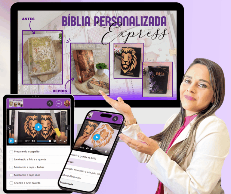 É o treinamento online com passo a passo completo para você transformar Bíblias comuns em Bíblias capa dura personalizadas e ter uma nova profissão lucrativa trabalhando em casa.